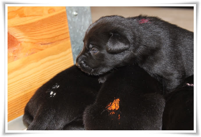 Die Welpen haben heute ganz viel erlebt. Nach dem Wiegen habe ich sie wie schon zuvor zu Mutti vor die Wurfkiste gelegt, während ich diese gesäubert habe. Dieses mal alle. Da die Kleinen nun die Umgebung wahrnehmen können, haben sie diese nach dem Säugen auch bewusst erkundet. So kamen sie z. B. direkt zu mir oder liefen auf Mozart zu. Und der hat dann auch begonnen ein bisschen mit ihnen zu spielen. Das war wirklich zu süß und natürlich habe ich es auch gefilmt. Dank unseres unterirdischen Netzes gibt's die Videos wie immer später.